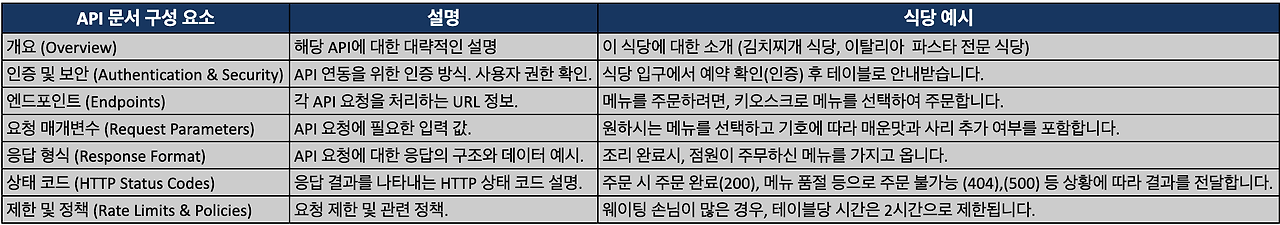 식당에서 가장 중요한 것은 메뉴와 주문 방식이에요. 즉 손님이 어떠한 메뉴를, 어떻게 주문하는지에 대한 설명이 있어야 고객이 주문할 수 있죠. 식당에서 이러한 설명을 제공하는 것이 메뉴판이라면, API에서는 API 문서가 그 역할을 해요.