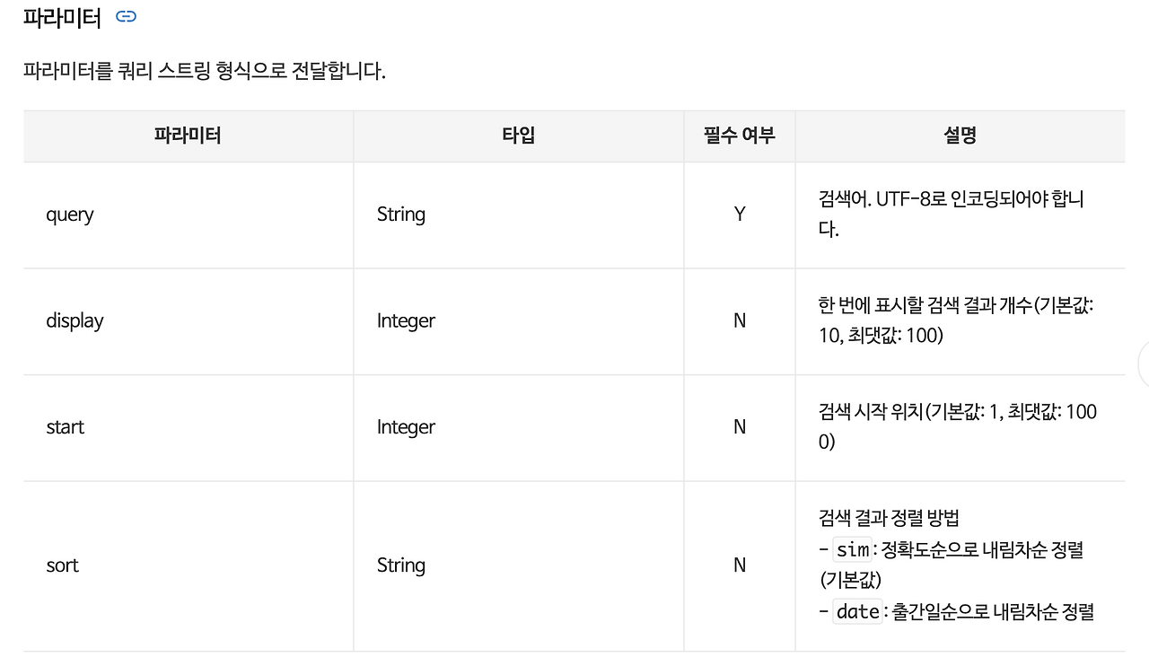 API 문서는 해당 API가 해결할 수 있는 문제와 제공하는 기능에 대한 기본적인 설명으로 시작돼요. 예를 들어, 네이버 검색 API는 네이버 검색 결과 중 책에 대한 데이터를 제공하는 API예요.