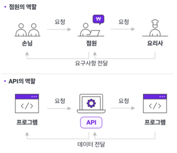 API를 더욱 자세히 이해하기 위해 점원이 요리사와 고객을 연결하는 과정을 떠올려 볼게요.
